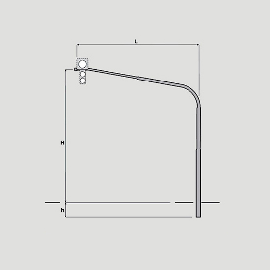 Las columnas semafóricas con pescante tienen base de ø168mm ó ø140mm, según proyecto y un largo de brazo de hasta 6,50m. Éste es desmontable para mayor facilidad de traslado e instalación